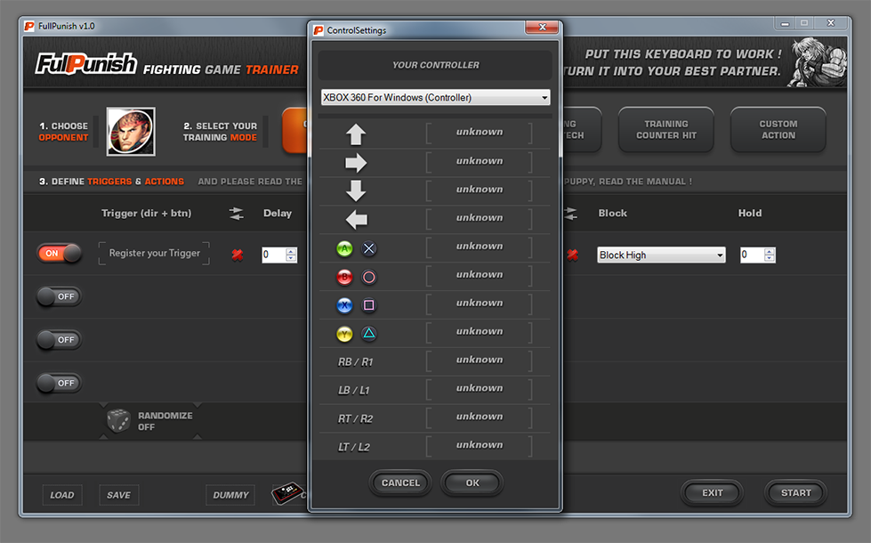 With this panel, FullPunish can register you controller, and understand where your buttons are, in order to display them correctly in the Trigger graphical representation. Just follow the button factory name that should still be printed next to each button on your controller.