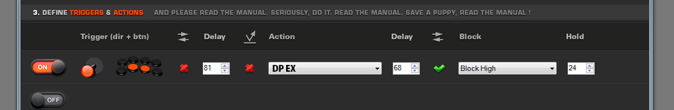 From left to right. The mandatory trigger (down back MK+HK in the picture). That’s the combination FullPunish waits to start pushing keyboard buttons. FullPunish will execute everything on the right of this trigger. You can't set a trigger that uses straight UP or DOWN.