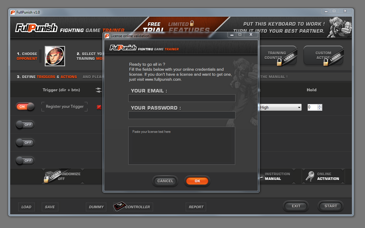 Trial mode is the default mode available when starting up the first time. Trial mode is more a free way to test how FullPunish runs on your computer than a way to test the application's features. In this mode, FullPunish is nerfed to low tier. Restricted modes and almost no action available.