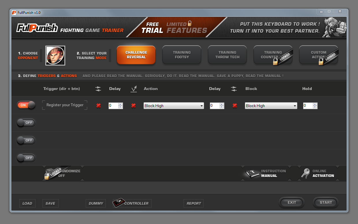 A simple mode to test you pokes, counter pokes, and anti air reactions. In this mode the opponent do the footsy dance and randomly stop to throw a move you selected before. If you active several Setups and active the Randomize option, the dummy will randomly stop dancing to do a move, but also randomly switch between the moves you selected. On Trial mode, the move list is quite small. Registered users get a bigger list of moves, but can create the move they need anyway.